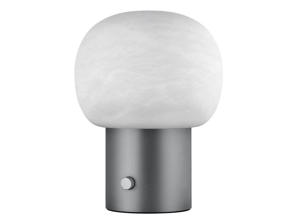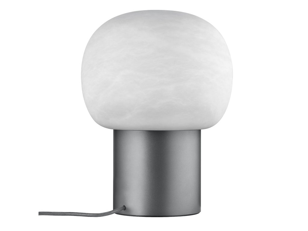 Kombinace šedého podstavce a jemně bílého skleněného stínidla vytváří harmonický kontrast. Ideální pro světlé místnosti, kde vynikne čistota designu.